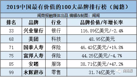 前100名中,閩籍企業——興業銀行、美團、國泰人壽保險、富邦人壽、安踏、永輝超市名列其中。
