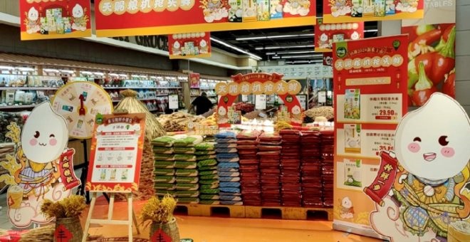田趣2020新米上市福州發布會為福州的顧客營造了新米豐收盛況,在全國永輝超市門店以“天賜糧機搶頭鮮”為核心宣傳點,基于田趣糧倉主題的“谷堆”、“米筐”、“麥穗”等經典元素進行了視覺化創意迭代,在保持品牌故事連貫性的同時,將田趣大米產地的風俗特色,滲透進線下店內營銷活動的場景升級中。