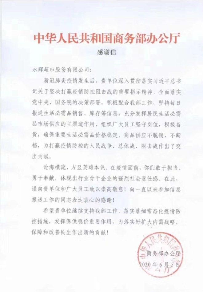 國家商務部致信表揚永輝抗疫貢獻