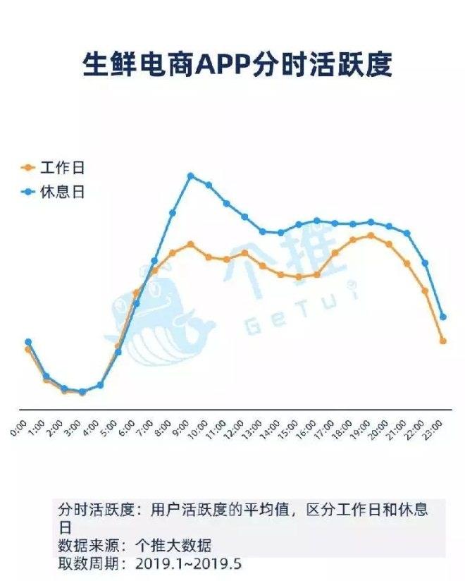 從生鮮電商APP的分時活躍度數據來看,工作日休息日的趨勢有較大差別。工作日活躍時間比較平均,在早上9點、中午12點會有活躍小高峰,晚上7點為活躍峰值。休息日主要在早上9點活躍,且活躍度明顯高于日常。