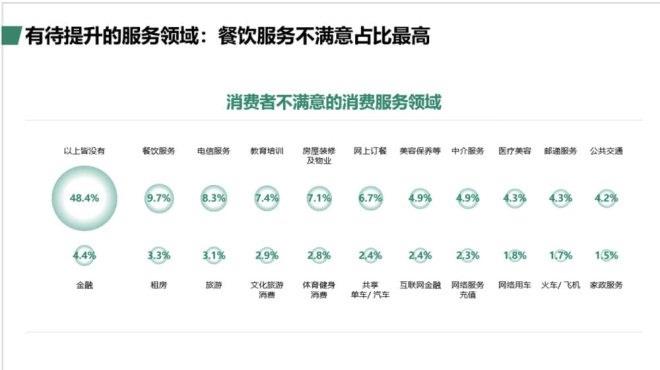 調查結果顯示,一半消費者不滿意的服務領域,涉及衣食住行、學習工作、社交娛樂等。其中,主要與“吃”相關的服務占16.4%,包括餐飲服務和網上訂餐。從區域看,除了餐飲服務外,蘇南和蘇中地區對通信服務也較不滿意,而蘇北地區對教育培訓和房屋裝修及物業較不滿意。