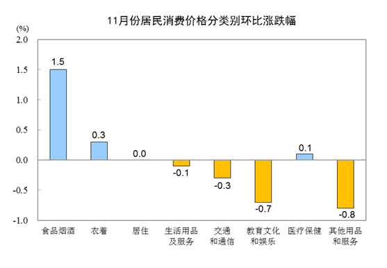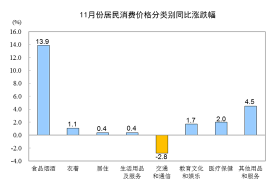 11月,全國居民消費價格環(huán)比上漲0.4%。其中,城市上漲0.3%,農村上漲0.5%;食品價格上漲1.8%,非食品價格持平;消費品價格上漲0.8%,服務價格下降0.4%。
