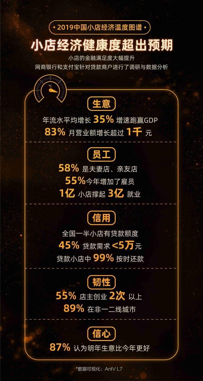12月19日,《2019中國小店經濟溫度圖譜》發(fā)布(以下簡稱小店圖譜)。網商銀行和支付寶的分析顯示,過去一年,以網店、街邊店、路邊攤等等組成的各類中國小店,無論是經濟活力,還是健康程度,均超出預期: