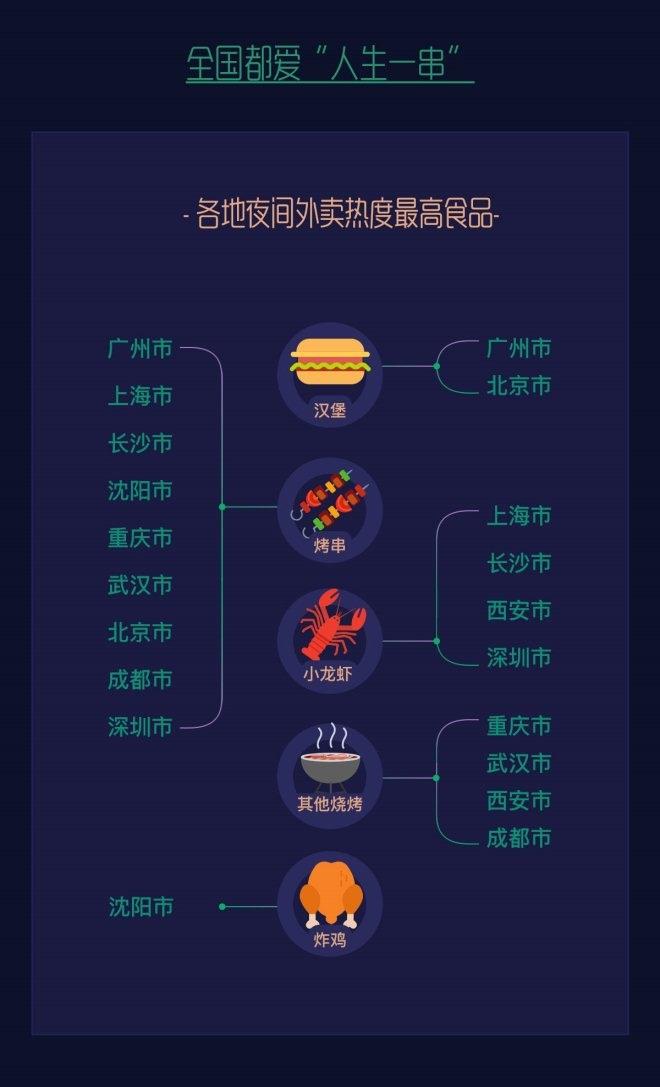 烤串成為多個(gè)城市美團(tuán)用戶最愛的夜間外賣。面包甜點(diǎn)、小龍蝦、火鍋、奶茶等其他宵夜品類也有明顯增長,折算成等價(jià)食物,約等于北京人民吃掉33萬串烤串,武漢人民吃掉22萬串烤串,上海人民吃了24萬只小龍蝦,逛吃逛吃”成為夜晚首選。北京人民最愛三里屯,重慶人都去解放碑。