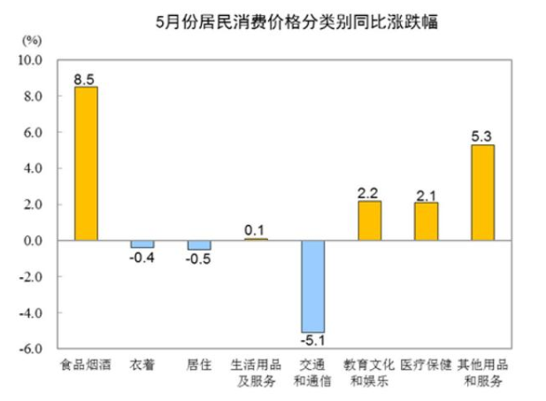 5月份,食品煙酒類價格同比上漲8.5%,影響CPI(居民消費價格指數)上漲約2.55個百分點。食品中,畜肉類價格上漲57.4%,影響CPI上漲約2.55個百分點,其中豬肉價格上漲81.7%,影響CPI上漲約1.98個百分點;水產品價格上漲3.7%,影響CPI上漲約0.07個百分點;糧食價格上漲1.5%,影響CPI上漲約0.03個百分點;鮮果價格下降19.3%,影響CPI下降約0.43個百分點;蛋類價格下降12.3%,影響CPI下降約0.08個百分點;鮮菜價格下降8.5%,影響CPI下降約0.22個百分點。