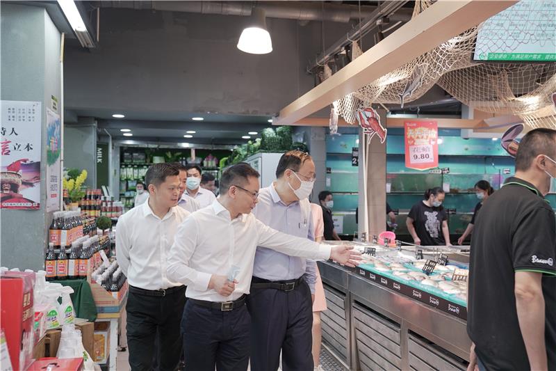 調研中,王炳南副部長深入了解了永輝超市內蔬菜、糧油、肉蛋等民生商品貨源、價格、及銷售情況,并對永輝超市為滿足居民日常生活基本消費和品質消費需求,豐富社區商業業態所做的努力和貢獻表示肯定,并組織全國各省市商務主管部門廳局代表到現場考察。