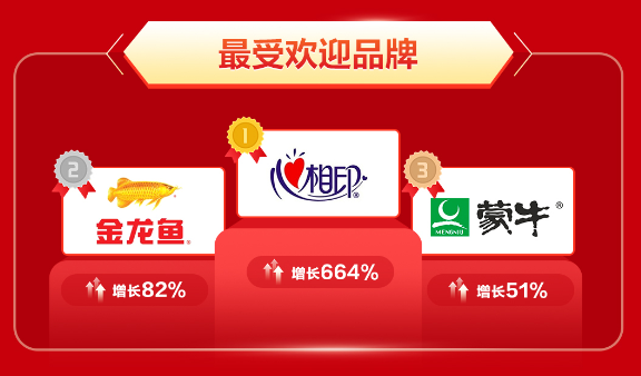 戰(zhàn)報顯示,心相印、金龍魚及蒙牛成為本次最受消費(fèi)者喜愛的品牌。其中心相印銷售額增長達(dá)664%。