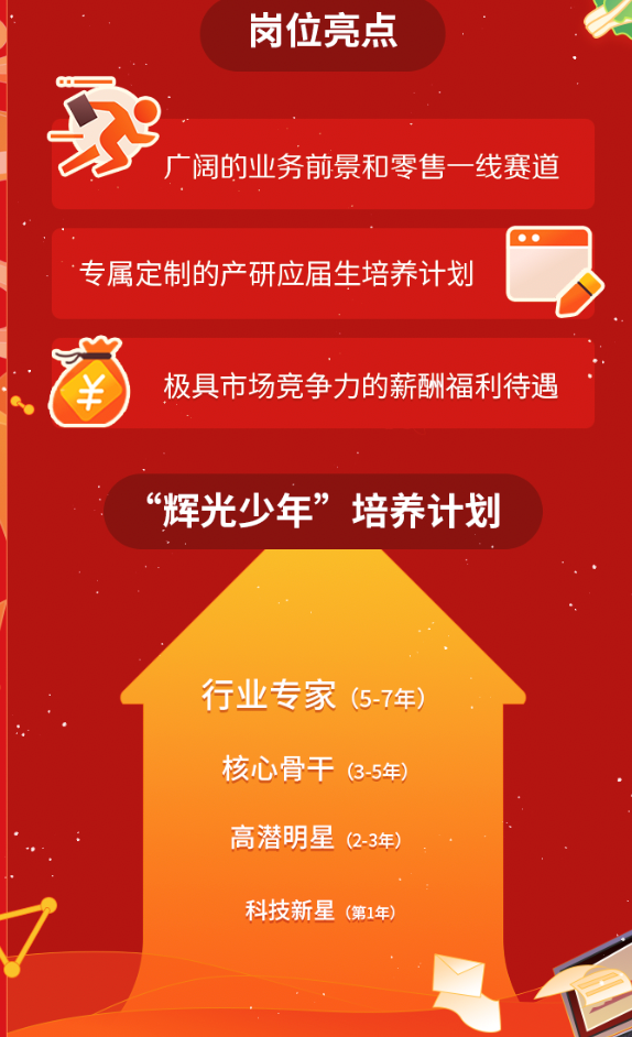上述負(fù)責(zé)人表示,除了極具市場(chǎng)競(jìng)爭(zhēng)力的薪酬福利待遇,永輝也為產(chǎn)研應(yīng)屆生推出了專屬的“輝光少年”計(jì)劃,其中第一年為“科技新星”階段,將分配經(jīng)驗(yàn)豐富的導(dǎo)師指導(dǎo),輔助新員工了解業(yè)務(wù)、走進(jìn)崗位。入職第二年后,員工將逐漸進(jìn)入“高潛明星”、“核心骨干”、“行業(yè)專家”階段,整個(gè)晉升周期約為5-7年,在不同階段的薪酬待遇和職級(jí)穩(wěn)步提升。