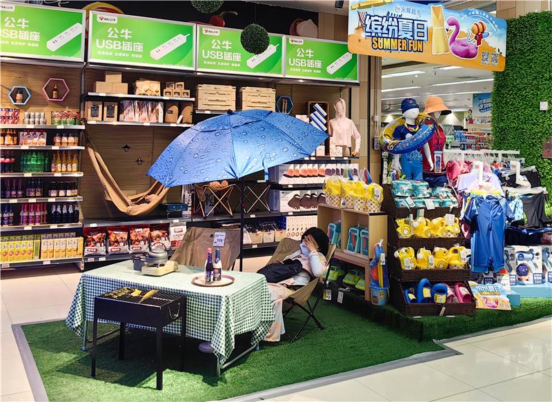 除此之外,永輝也在多家門店內增加了場景式的主題布置,即根據季節、節慶、消費場景的不同,在店內公共區域設置主題并集中展示關聯產品。如懸掛了多個游泳圈的歡樂水上用品陳列區、布置了野餐墊和躺椅的戶外用品陳列區、集合了牙膏、牙刷、漱口水、牙線棒等關聯產品的口腔健康陳列區等,滿足消費者在某一場景下的一站式購物需求。