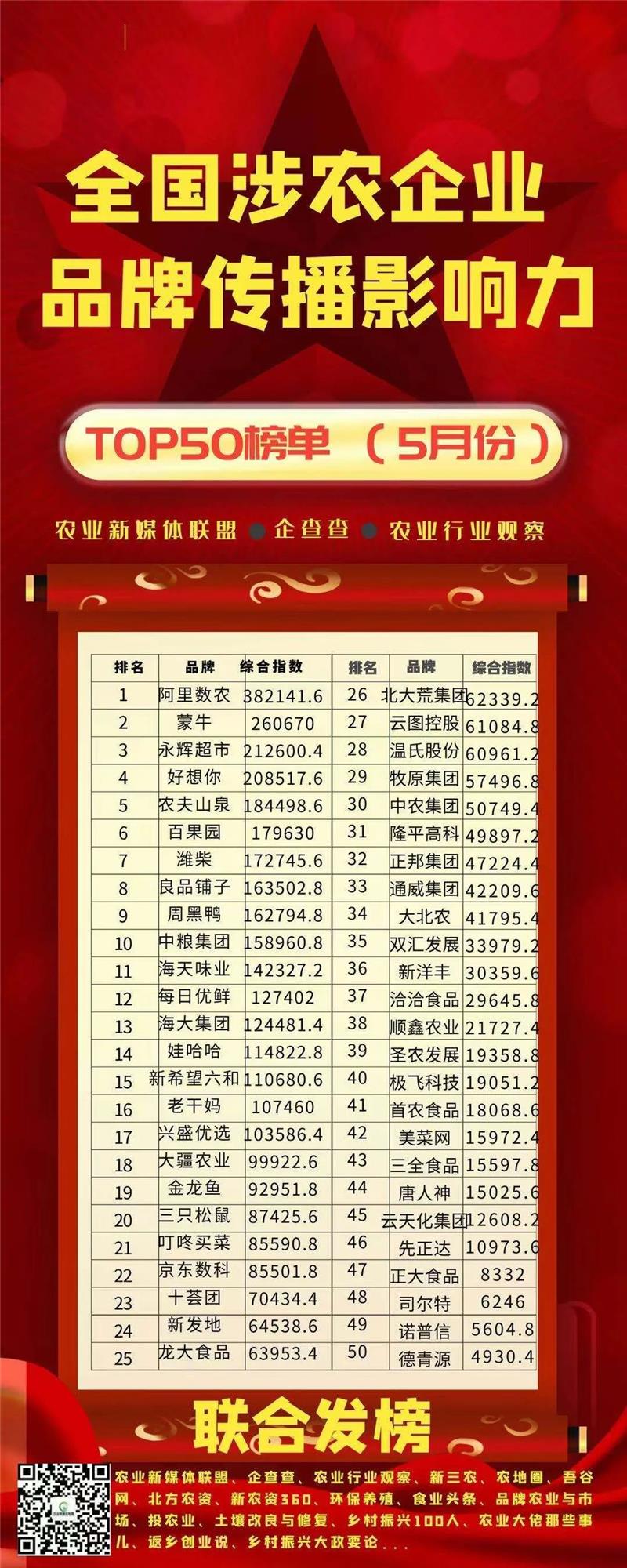 5月份全國涉農企業品牌傳播影響力TOP50發布 永輝名列前三
